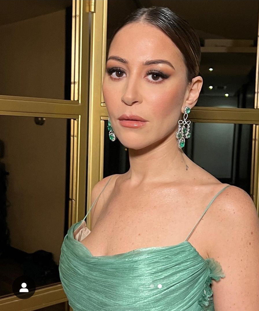 اما من الناحية الجمالية، اعتمدت لم خصلات شعرها للوراء كعكه ووضعت مكياجًا صاخبًا مرتكزًا على الألوان الترابية مع تحديد عينيها بالكحل والماسكرا السوداء ولون النود في الشفاه.
