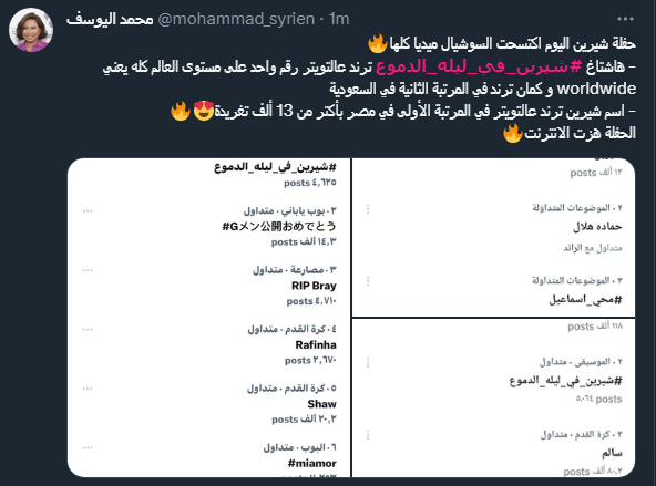 شيرين تجعل ليلة الدموع “تريند” رقم واحد على مواقع التواصل الاجتماعي: