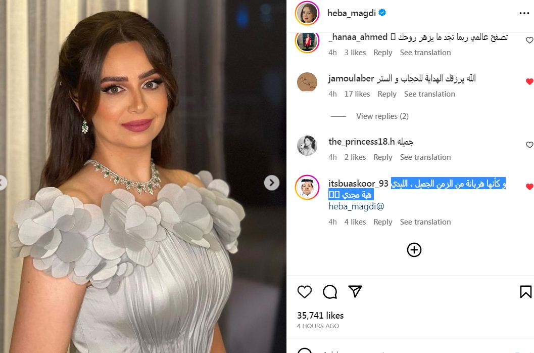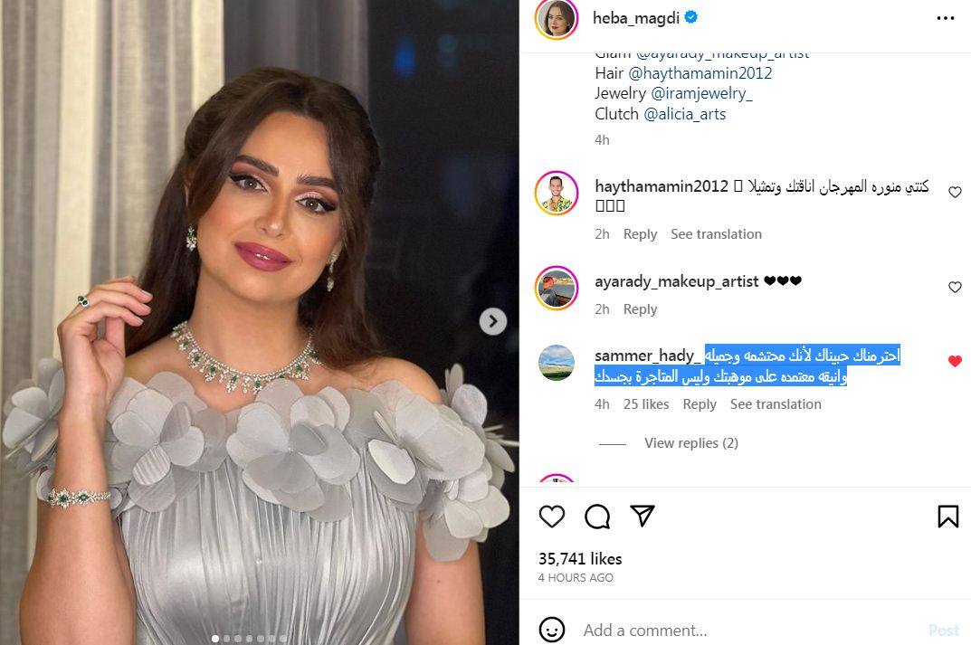 وتفاعل الجميع مع إطلالتها وجاءت أبرز التعليقات مؤيده لها رصدنا أبرزها: "احترمناك حبيناك لأنك محتشمه وجميله وانيقه معتمده على موهبتك وليس المتاجرة بجسدك، حاجه كده من ريحه الزمن ال كله رقي وفن، الرقة و الجمال و الدالال و الاحترام كما أنزل، و كأنها هربانة من الزمن الجميل ، الليدي هبة مجدي".