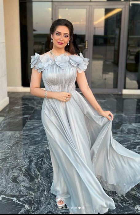 وبدت هبة مجدي كالأميرة بإطلالتها المفعمة بالرقي والاحتشام في آن واحد، حيث ارتدت فستان طويل فضفاض بخصر مجسم ومكشكش من الأمام، ينتمي لقصة الكب المزين بالزهور الكبيرة، صمم من قماش الحرير باللون الرمادي، فيما انتعلت صندل بكعب عال.