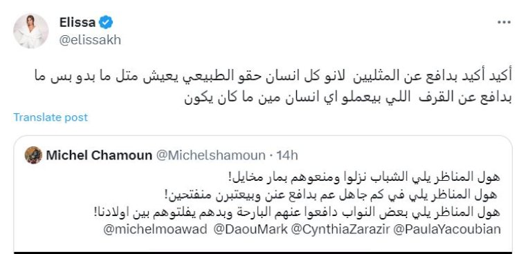 وكتبت إليسا خلال تغريدة تقول فيها: «أكيد أكيد بدافع عن المثليين لأنه كل انسان حقو الطبيعي يعيش متل ما بدو بس ما بدافع عن القرف اللي بيعملو اي انسان مين ما كان يكون».
