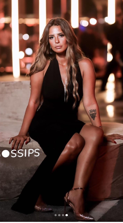 تألقت إيمان العاصي بإطلالة أنثوية مثيرة، حيث كانت ترتدي فستان ساحر باللون الأسود، مكشوف الأكمام وذا فتحة صدر جريئة، بالإضافة إلى فتحة طويلة كشفت عن ساقيها بالكامل، فيما انتعلت حذاء ذا كعب عالٍ باللون الذهبي اللامع، مما أبرز أنوثتها الطاغية وعكس قوامها الرشيق الممشوق.