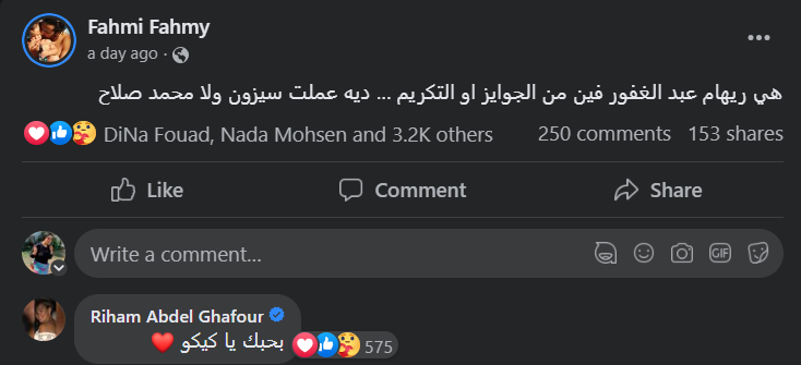 أعرب كريم فهمي عن استيائه الشديد من تجاهل مهرجان القاهرة للدراما في دورته الثانية لتكريم ريهام عبد الغفور، أو منحها جائزة أفضل ممثلة، وذلك خلال منشور عبر حسابه الشخصي بموقع التواصل الاجتماعي الأشهر "فيس بوك"، حيث قال: "هي ريهام عبدالغفور فين من الجوايز أو التكريم ؟!… دي عملت سيزون ولا محمد صلاح"، لترد عليه قائلة: "بحبك يا كيكو".