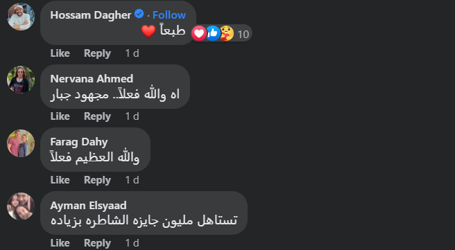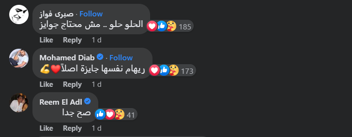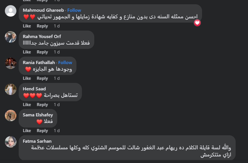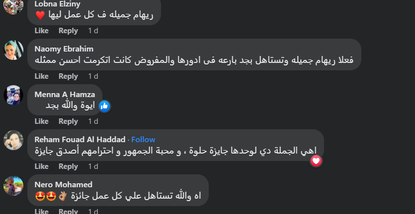 في الوقت نفسه، أيد رواد السوشيال ميديا تصريحات النجم كريم فهمي، مؤكدين أن الفنانة ريهام عبد الغفور أحسن ممثلة بدون منازع، وتستحق التكريم وجائزة على كل عمل فني قدمته خلال هذا الموسم، وجاءت أبرز التعليقات كالآتي: "فعلا قدمت سيزون جامد جدا .. وجودها هو الجايزه .. والله لسة قايلة الكلام ده ريهام عبد الغفور شالت للموسم الشتوي كله وكلها مسلسلات عظمة ازاي متتكرمش .. احسن ممثله السنه دى بدون منازع و كفايه شهادة زمايلها و الجمهور تحياتي .. احسن ممثله في مصر .. تستاهل مليون جايزه الشاطره بزياده .. فعلا ريهام جميله وتستاهل بجد بارعه فى ادورها والمفروض كانت اتكرمت احسن ممثله .. اهي الجملة دي لوحدها جايزة حلوة ، ومحبة الجمهور واحترامهم أصدق جايزة.. اه والله تستاهل علي كل عمل جائزة".