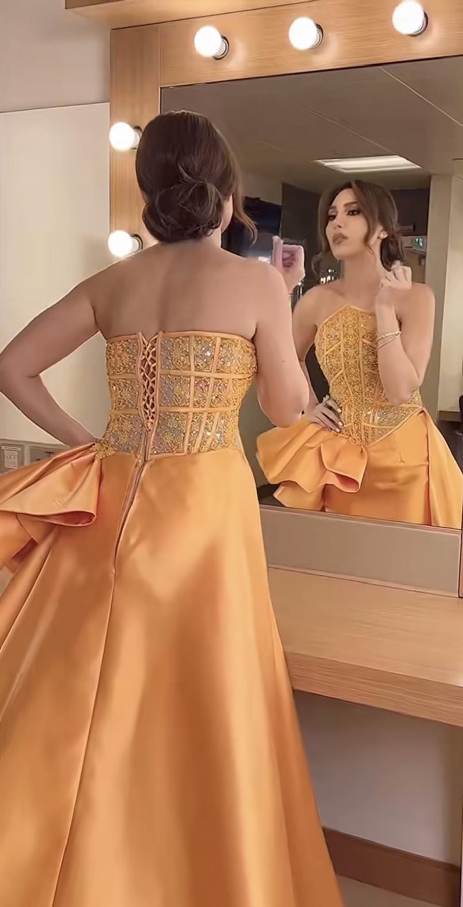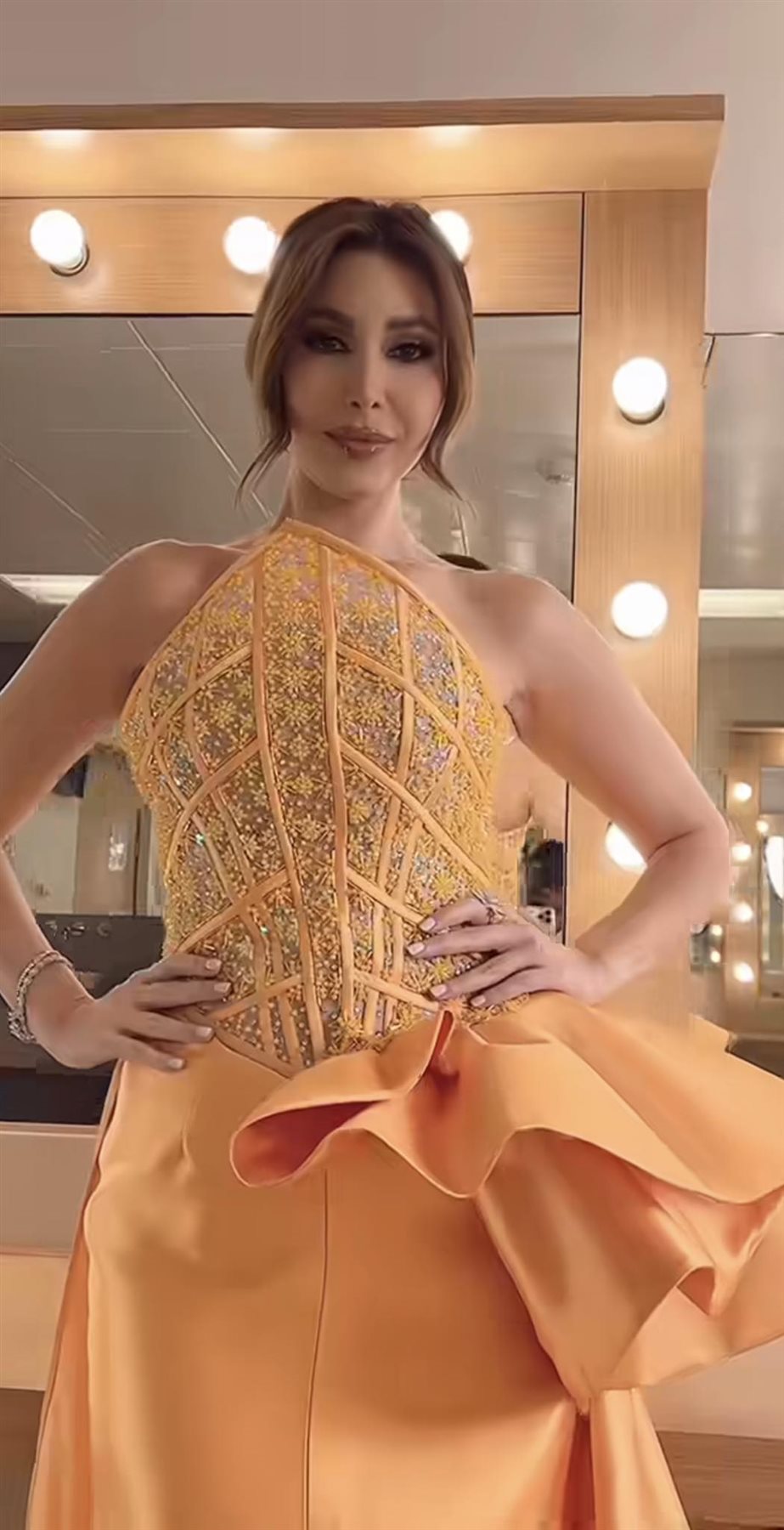 وبدت يارا بفستان صيحة الكب باللون البرتقالي والأصفر، فكان بطرز من الجزء العلوي بالورود، ومن الأسفل مصنوع من قماش الستان المكشوف من احدى الساقين، بالإضافة لكشكشة على أحد الجانبين، والجنب الآخر إكستنشن طويل، مما عكس أناقتها وقوامها الممشوق.