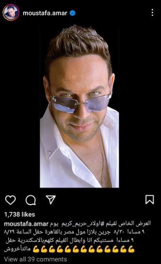 وكتب النجم مصطفى قمر، عبر حسابه الرسمي قائلًا : "العرض الخاص لـ فيلم اولاد حريم كريم 30/8، الساعة 9 مساءً، وحفل الساعة 9 مساء يوم 29/8 بالإسكندرية متتأخروش".