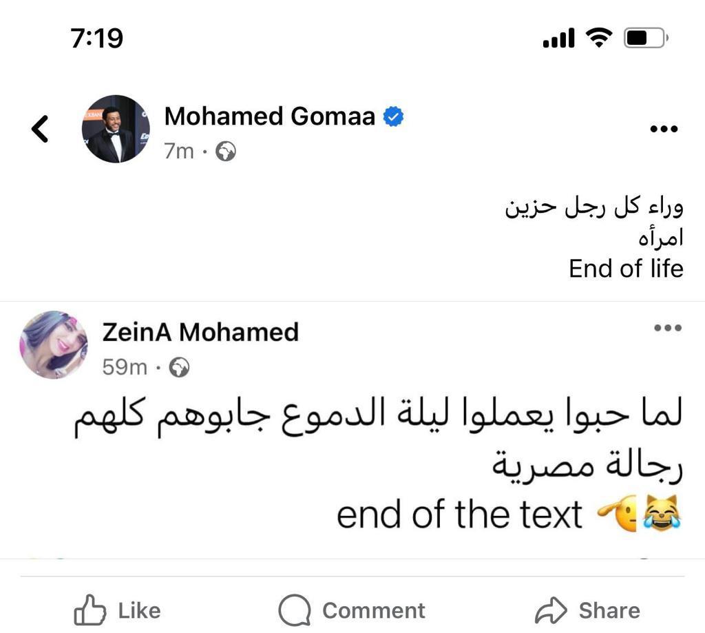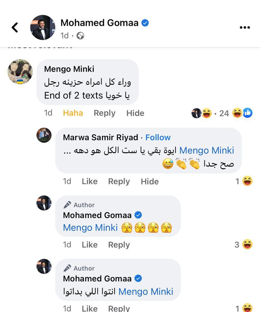 من ضمن تلك التعليقات هو تعليق النجمة منة شلبي على صفحة النجم محمد جمعة بعد مشاركته في حفل ليلة الدموع بشخصية الشهيرة "عم ضياء"، ليعلق بعدها جمعة على منشور شاركه الجمهور قائلًا: لما يحبوا يعملوا حفل ليلة الدموع جابوا الحفلة كلها رجالة"، ليرد جمعة قائلا؛ " ورا كل رجل حزين أمرآة end of life ".