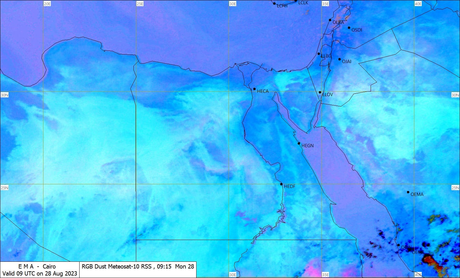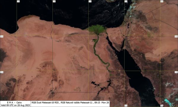 وفي هذا التوقيت من اليوم الاثنين الموافق 28 أغسطس، سجلت درجة الحرارة على القاهرة الكبرى المقاسة في الظل 33 درجة مئوية، بينما درجة الحرارة المحسوسة 36 درجة مئوية، وفق هيئة الأرصاد.