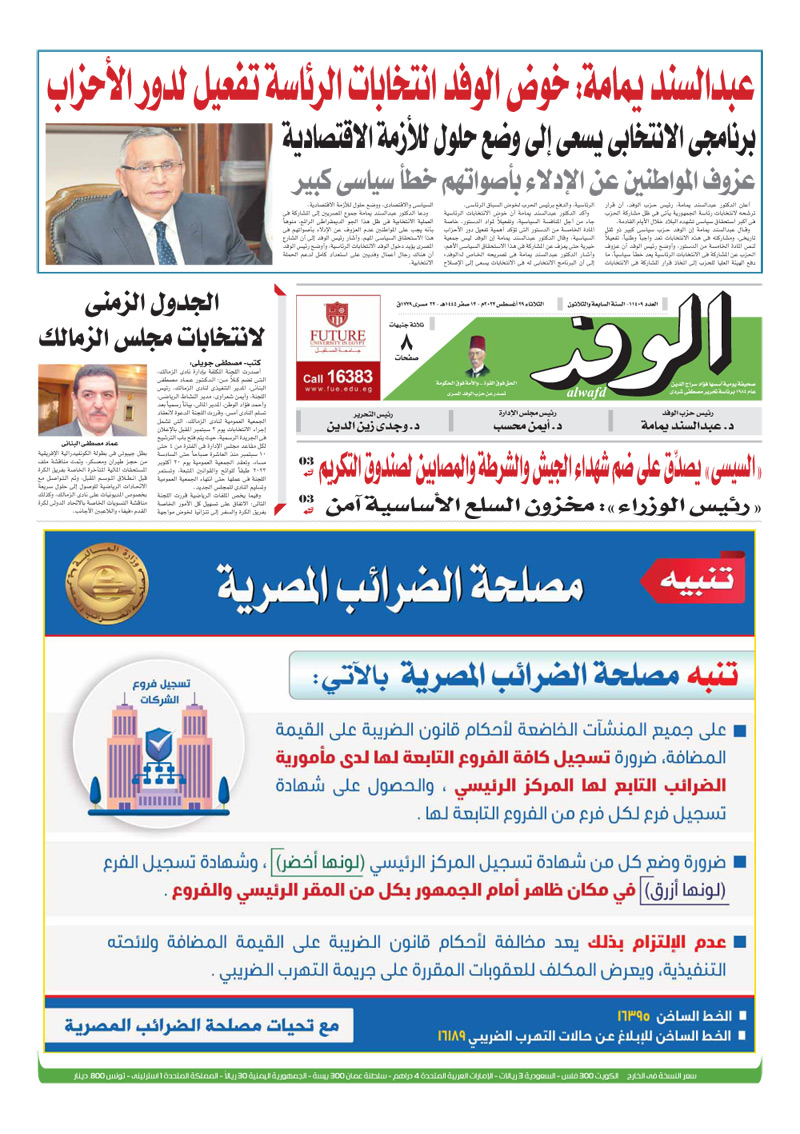 تنشر جريدة الوفد اليومية الورقية في عددها الصادر، غدًا الثلاثاء، العديد من الموضوعات والتقارير الإخبارية المهمة، أبرزها: "عبدالسند يمامة: خوض الوفد انتخابات الرئاسة تفعيل لدور الأحزاب".