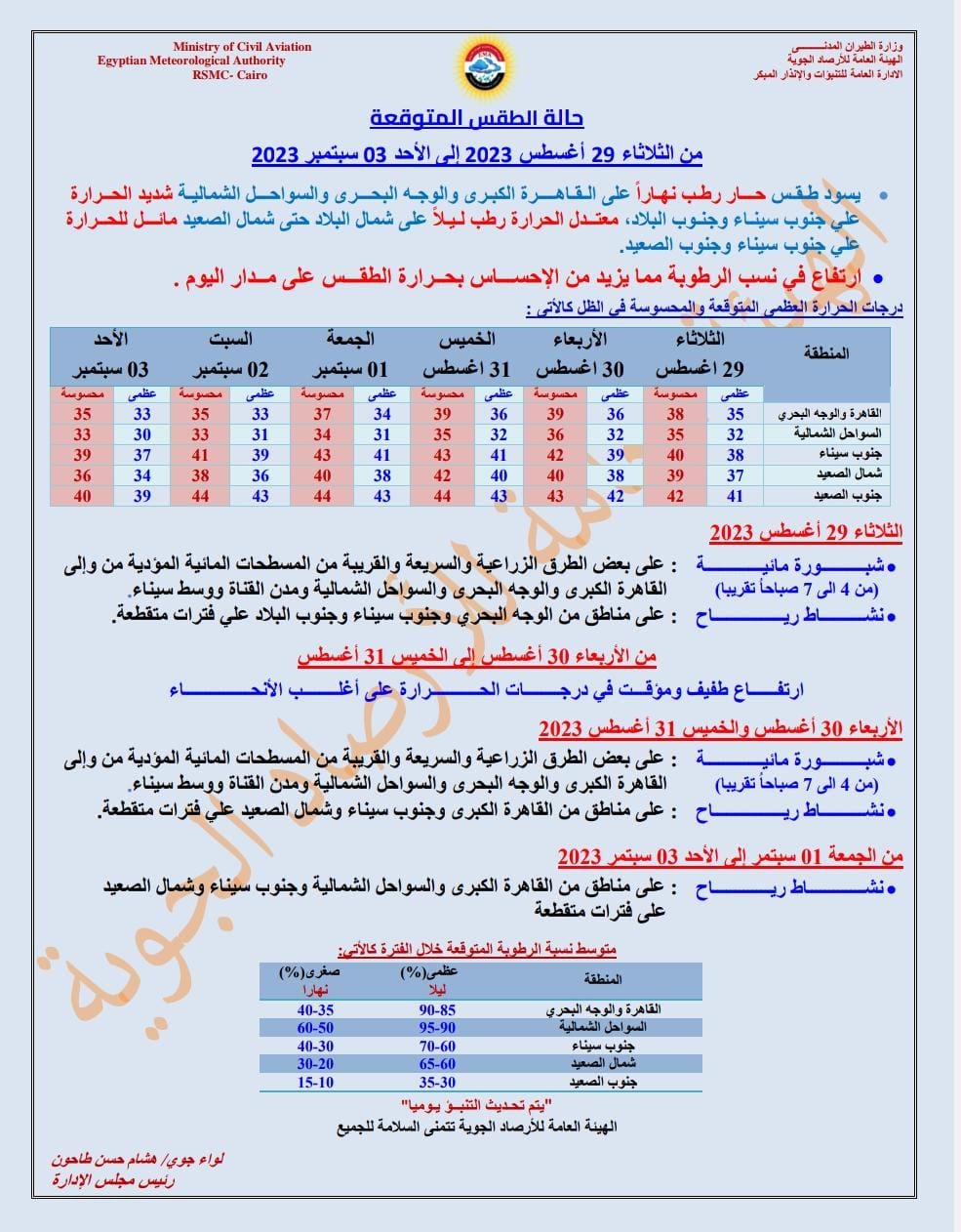 وتتوقع الأرصاد الجوية، أن يكون هناك ارتفاع في نسب الرطوبة مما يزيد من الإحساس بحرارة الطقس على مدار، وهناك فرص لتكوين شبورة مائية على بعض الطرق الزراعية والسريعة والقريبة من المسطحات المائية المؤدية من وإلى القاهرة الكبرى والوجه البحري والسواحل الشمالية، ويكون هناك نشاط للرياح على مناطق من الوجه البحري وجنوب سيناء وجنوب البلاد.