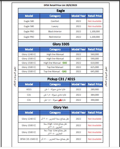 وخلت القائمة الصادرة اليوم من أسعار السيارة الرياضية متعددة الاستخدامات إيجل 580 لنفاد مخزون السيارة، وكذلك جلوري فان موديل 2022.