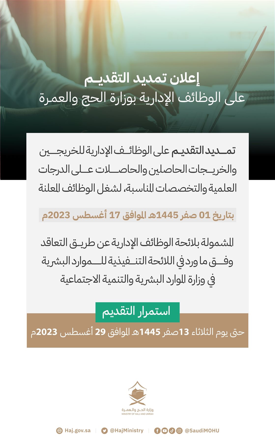 أعلنت وزارة الحج والعمرة، تمديد التقديم على الوظائف الإدارية المشمولة بسلم رواتب الموظفين العام، للخرجين والخريجات ممن يحملون الدرجات العلمية والتخصصات المناسبة لشغل تلك الوظائف والتي أعلنت عنها يوم 17 أغسطس .