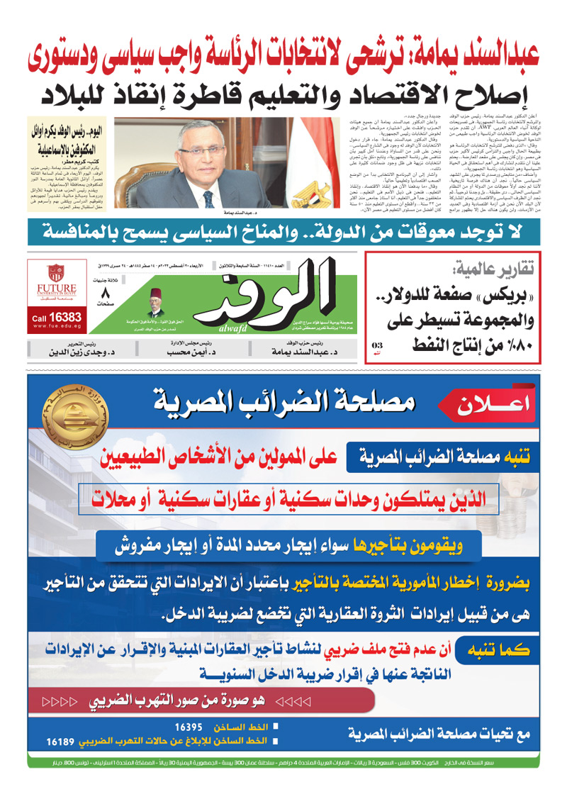تنشر جريدة الوفد اليومية الورقية في عددها الصادر، غدًا الأربعاء، العديد من الموضوعات والتقارير الإخبارية المهمة، أبرزها: "عبدالسند يمامة: ترشحي لانتخابات الرئاسة واجب سياسي ودستوري".