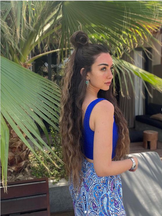 من الناحية الجمالية، اعتمدت هنا الزاهد تصفيفة شعر جذابة، فقامت برفع بعض خصلاتها شكل البومبيه أعلى الرأس، وتركت باقي خصلاتها تتدلى على ظهرها بصيحة الكيرلي الناعم.
