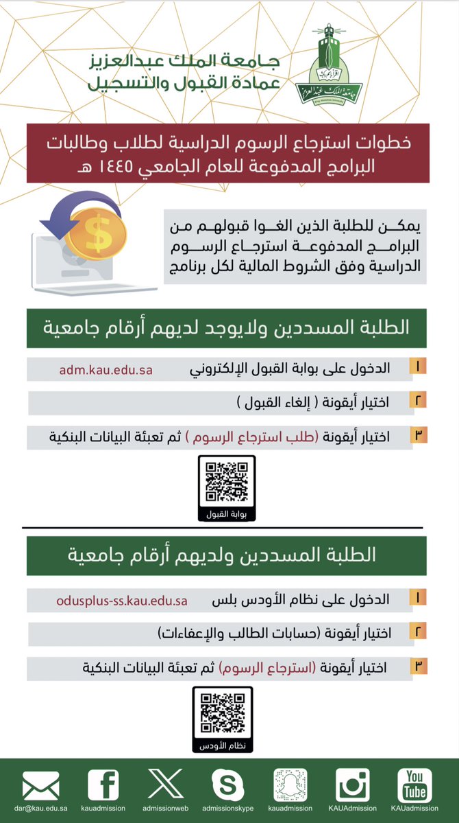 كما أوضحت عماد القبول بالجامعة خطوات استرجاع الرسوم الدراسية لطلاب وطالبات البرامج المدفوعة للعام الجامعي 1445ه، والذين قاموا بإلغاء قبولهم.