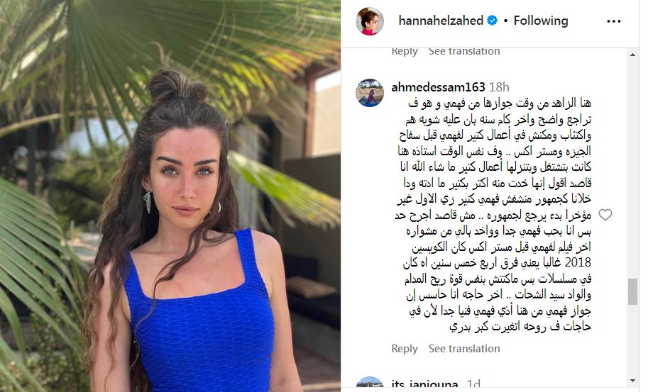 نشرت الفنانة هنا الزاهد صور لها عبر إنستجرام، لتشارك جمهورها أحدث إطلالتها، ووسط معجبيها، علق متابع عليها ليتهمها بأنها السبب في تراجع أحمد فهمي من الناحية الفنية، قائلًا: " هنا الزاهد من وقت جوازها من فهمي وهو في تراجع واضح واخر كام سنه بان عليه شويه هم واكتئاب ومكنش في أعمال كتير لفهمي قبل سفاح الجيزة ومستر إكس.. وفي نفس الوقت استاذه هنا كانت بتشتغل وبتنزلها أعمال كتير ما شاء الله أنا قاصد أقول إنها خدت منه أكتر بكتير ما ادته ".