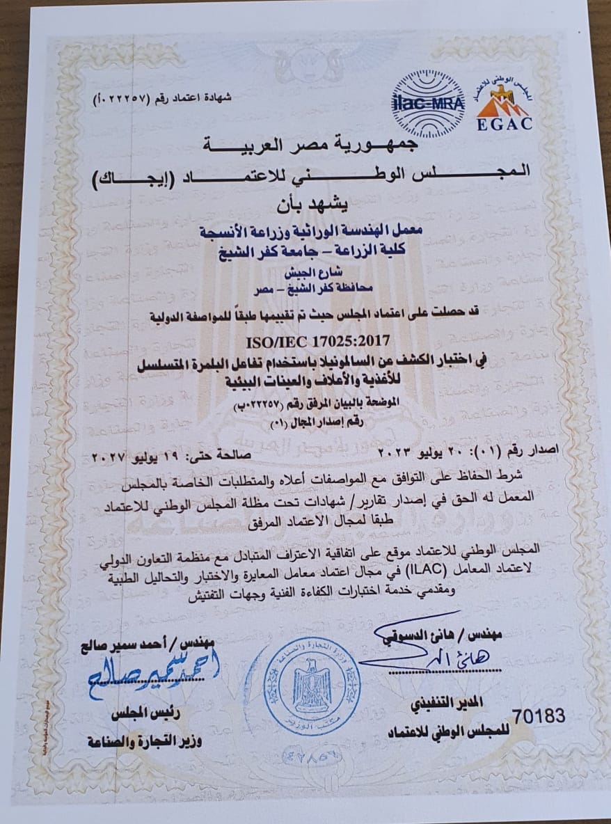 أعلن رئيس جامعة كفرالشيخ، الدكتور عبدالرازق دسوقي، الخميس، اعتماد معمل الهندسة الوراثية وزراعة الأنسجة (GETCL)، أحد المعامل الرائدة في تقديم الخدمات التعليمية والبحثية والمجتمعية المتميزة، وذلك من قبل المجلس الوطني للاعتماد (EGAC) طبقا للمواصفة ISO 17025/2017 في مجال الكشف عن السالمونيلا باستخدام تفاعل البلمرة المتسلسل ( qPCR)، للأغذية، والأعلاف، والعينات البيئية.