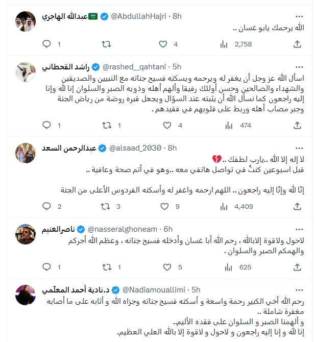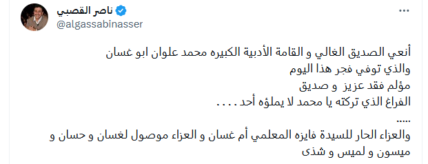 ونعاه الكثير من السعوديين من محبيه وزملائه وعدد من المشاهير عبر حسابتهم بموقع "اكس"، وكتب الفنان ناصر القصبي، الكاتب الراحل قائلا: "أنعي الصديق الغالي والقامة الأدبية الكبيرة محمد علوان أبو غسان، والذي توفي فجر هذا اليوم.. مؤلم فقد عزيز وصديق، الفراغ الذي تركته يا محمد لا يملؤوه أحد".