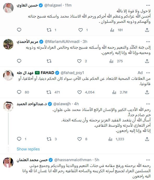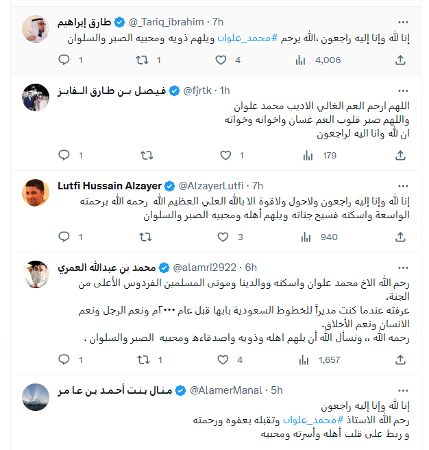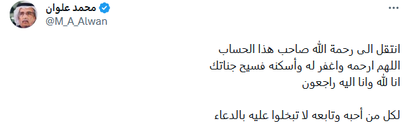 يذكر أن الحساب الموثق للكاتب السعودي محمد علوان أعلن خبر رحيله اليوم وكتب عبر موقع التغريدات القصيرة "اكس":" انتقل الى رحمة الله صاحب هذا الحساب اللهم ارحمه واغفر له وأسكنه فسيح جناتك انا لله وانا اليه راجعون لكل من أحبه وتابعه لا تبخلوا عليه بالدعاء".