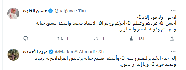 وودعه الكثيرون عبر العديد من التغريدات منها:" اللهم اغفر له وارحمه وعافه واعف عنه وأكرم نزله ووسع مدخله واغسله بالماء والثلج والبرد ونقه من الذنوب والخطايا كما ينقى الثوب الأبيض من الدنس وجازه بالحسنات إحسانا وبالسيئات عفوا وغفرانا وأكرم وفادته عليك وأحسن نزله لديك واجعله من أهلك وخاصتك".