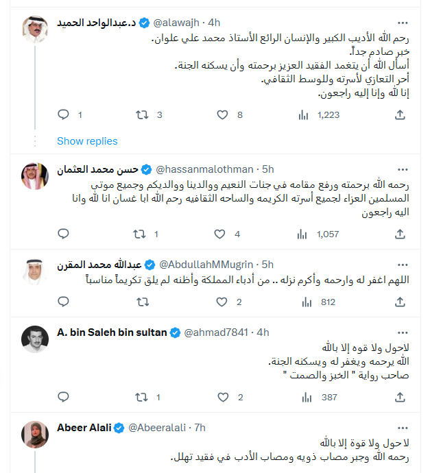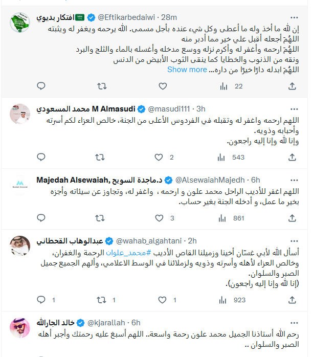 وبالدعاء قال :" رحم الله الاخ محمد علوان واسكنه ووالدينا وموتى المسلمين الفردوس الأعلى من الجنة..عرفته عندما كنت مديراً للخطوط السعودية بابها قبل عام ٢٠٠٠م ونعم الرجل ونعم الانسان ونعم الأخلاق..رحمه الله، ونسأل الله أن يلهم اهله وذويه واصدقاءه ومحبيه الصبر والسلوان"، و"رحم الله الأديب الكبير والإنسان الرائع الأستاذ محمد علي علوان. خبر صادم جداً. أسأل الله أن يتغمد الفقيد العزيز برحمته وأن يسكنه الجنة. أحر التعازي لأسرته وللوسط الثقافي. إنا لله وإنا إليه راجعون".