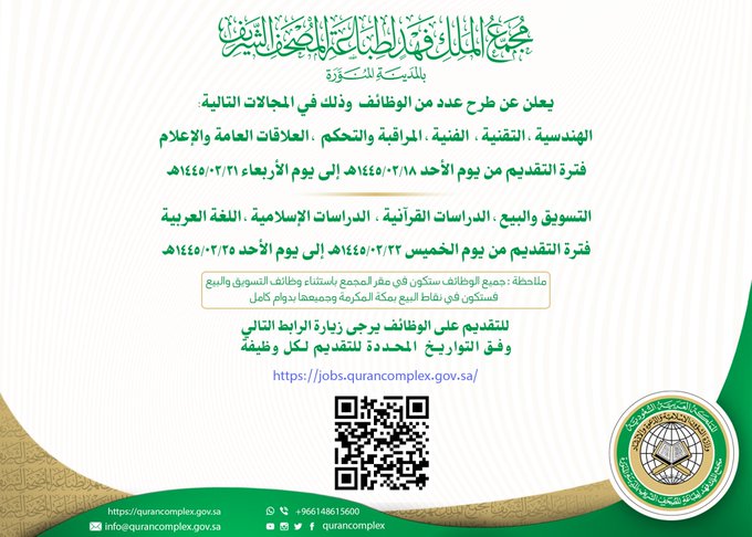 طرح مجمع الملك فهد لطباعة المصحف الشريف بالمدينة المنورة، عددًا من الوظائف الشاغرة لديه لمن يحمل الجنسية السعودية فقط، وغير مرتبط بعمل آخر حيث إنه اشترط التفرغ التام.