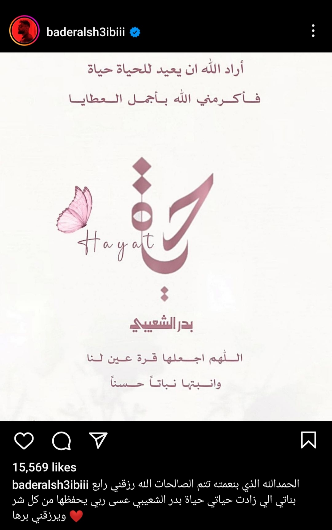 فاجأ بدر الشعيبي جمهوره بالخبر السعيد من خلال منشور عبر صفحته الرسمية في "إنستجرام"، حيث كتب: "الحمد لله الذي بنعمته تتم الصالحات الله رزقني رابع بناتي اللي زادت حياتي حياة بدر الشعيبي عسى ربي يحفظها من كل شر ويرزقني برّها".