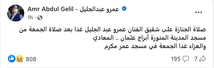 عمرو عبد الجليل يعلن تفاصيل موعد صلاة جنازة وعزاء شقيقه