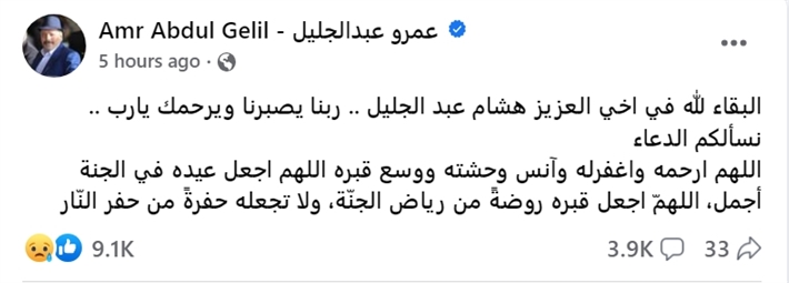 وكان عمرو عبد الجليل أعلن الخميس وفاة شقيقه هشام، وكتب عبر صفحته في فيسبوك: "البقاء لله في اخي العزيز هشام عبد الجليل .. ربنا يصبرنا ويرحمك يارب .. نسألكم الدعاء اللهم ارحمه واغفرله وآنس وحشته ووسع قبره اللهم اجعل عيده في الجنة أجمل، اللهمّ اجعل قبره روضةً من رياض الجنّة، ولا تجعله حفرةً من حفر النّار".