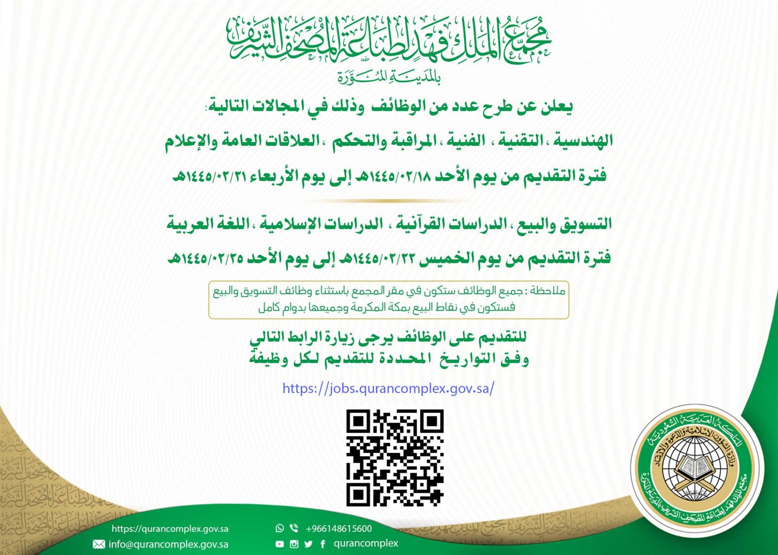 ومن المقرر أن يفتح مجمع الملك فهد لطباعة المصحف الشريف باب التقديم على الوظائف وفق التواريخ المحددة في الإعلان ومن خلال الدخول على بوابة نفاذ الوطنية.