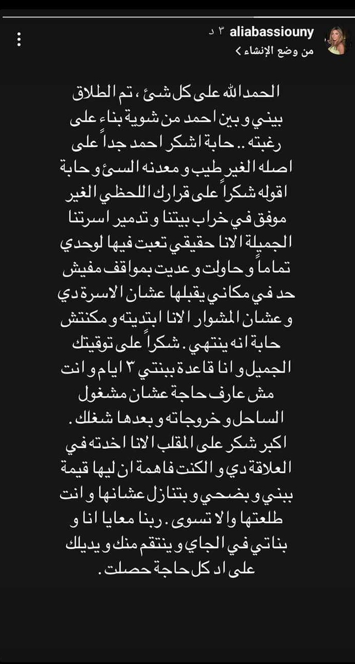 كتبت علياء بسيوني: "الحمد لله على كل شيء، تم الطلاق بيني وبين أحمد من شوية بناءً على رغبته، حابة أشكر أحمد جدًا على أصله غير الطيب ومعدنه السيء، وأحب أقوله شكرًا على قرارك اللحظي غير الموفق في خراب بيتنا، وتدمير أسرتنا الجميلة اللي أنا حقيقي تعبت فيها لوحدي تمامًا، وحاولت وعديت بمواقف مفيش حد في مكاني يقبلها عشان الأسرة دي، وعشان المشوار اللي أنا ابتديته ومكنتش حابة إنه ينتهي".