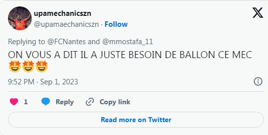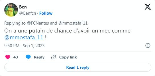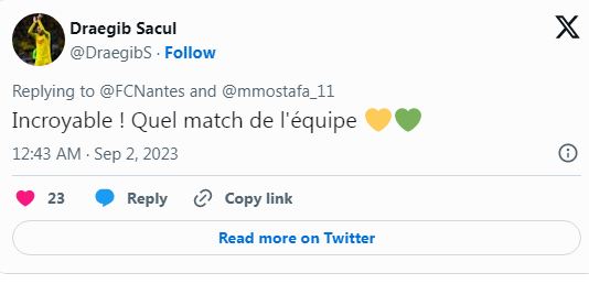 وعبر مشجع جديد عن رأيه في الفرعون المصري: "نحن محظوظون لنملك لاعب مثلك في نانت".