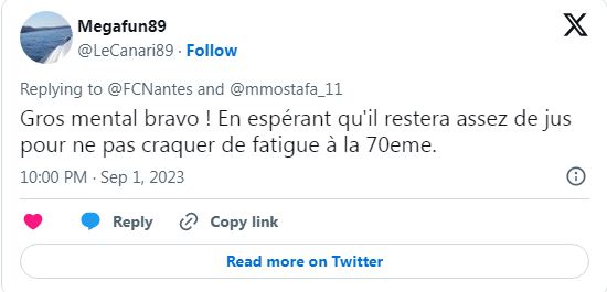 كما علق مشجع أخر وكتب: "برافو، تصرف رائع في لحظة الهدف، على أمل أن يزيد من لياقته البدنية حتى نستفيد منه حتى نهاية المباراة ولا يتم استبداله بعد 70 دقيقة".