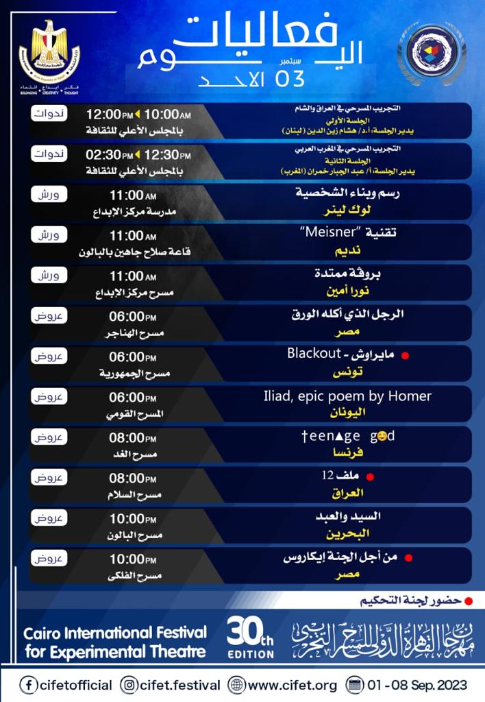 وفي تمام الساعة السادسة مساء، يعرض على المسرح القومي العرض اليوناني"Iliad, epic poem by Homer" وفي التوقيت نفسه يُعرض على مسرح الجمهورية التونسي "ما يراوش"، وفي نفس التوقيت يُقدم العرض المصري "الرجل الذي أكله الورق" على مسرح الهناجر، وفي تمام الساعة الثامنة مساء يُقدم العرض الفرنسي"Teenage god" على مسرح الغد، وفى التوقيت ذاته يُقدم العرض العراقي "ملف 12" على مسرح السلام، وفي تمام الساعة العاشرة مساء يُقدم العرض البحريني "السيد والعبد" على مسرح البالون، وفي التوقيت نفسه يُقدم العرض المصري "الجنة من أجل إيكاروس" على مسرح الفلكي.