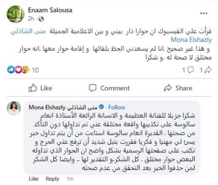 وأضافت منى الشاذلي: "القديرة إنعام سالوسة استاءت من أن يتم تداول خبر يسئ لي مهنيًا و فكريًا، فقررت بنبل شديد أن ترفع عني الحرج وتكتب على صفحتها الرسمية بشكل واضح أن الحوار الذي تداوله البعض حوار مختلق .. كل الشكر والتقدير لها .. وأيضًا كل الشكر لمن حذفوا الخبر بعد التحقق من عدم صحته".