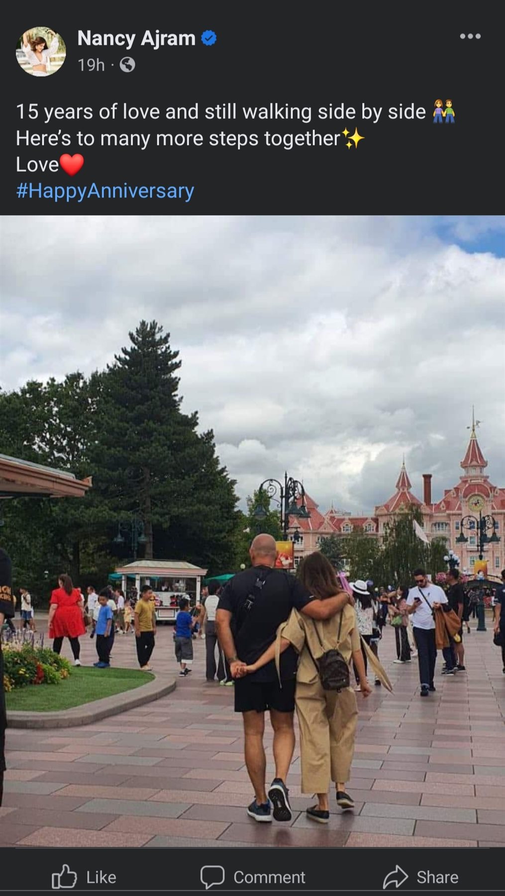 إحتفلت نانسي عجرم عن طريق نشرها صورهما العائلية اللطيفة في ديزني لاند بفرنسا، بذكرى عيد زوجهما من خلال صورة رومنسبة ظهرت فيه بين أحضان زوجها خلال تواجدها في ديزني لاند.
