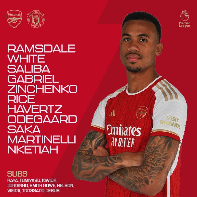أعلن المدرب الإسباني مايكل أرتيتا المدير الفني لنادي أرسنال، تشكيل الفريق الذي سيخوض مواجهة مانشستر يونايتد، والتي تجمع الفريقين ضمن مواجهات الجولة الرابعة من مباريات الدوري الإنجليزي لنسخة الموسم الحالي 2023 - 2024.