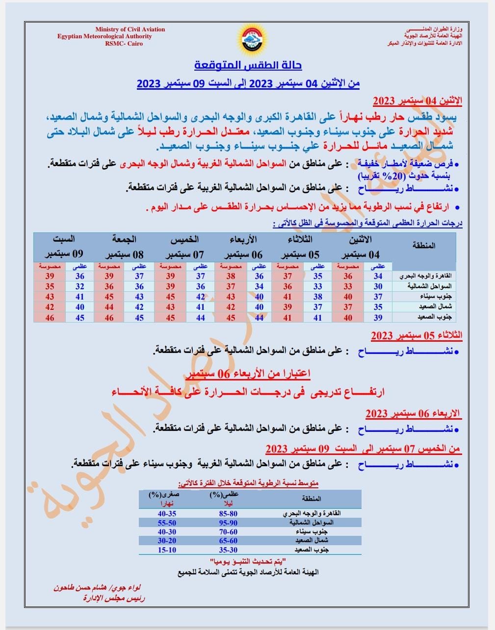 أعلنت الهيئة العامة لـ الأرصاد الجوية، عن حالة الطقس ودرجات الحرارة المتوقعة خلال الفترة من غد الإثنين وحتى السبت 9 سبتمبر 2023، إذ إنه من المتوقع أن يسود طقس حار رطب نهارًا على القاهرة الكبرى والوجه البحري والسواحل الشمالية وشمال الصعيد.