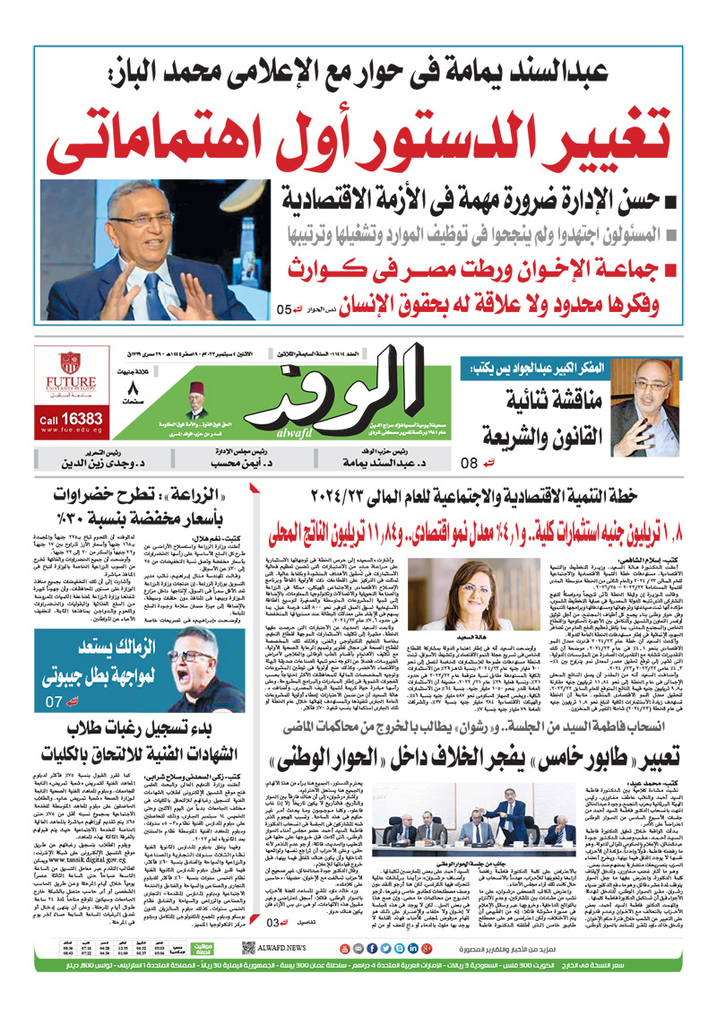 تنشر جريدة الوفد اليومية الورقية في عددها الصادر غدًا الاثنين، العديد من الموضوعات والتقارير الإخبارية المهمة، أبرزها "عبدالسند يمامة في حوار مع الإعلامي محمد الباز: تغيير الدستور أول اهتماماتي".