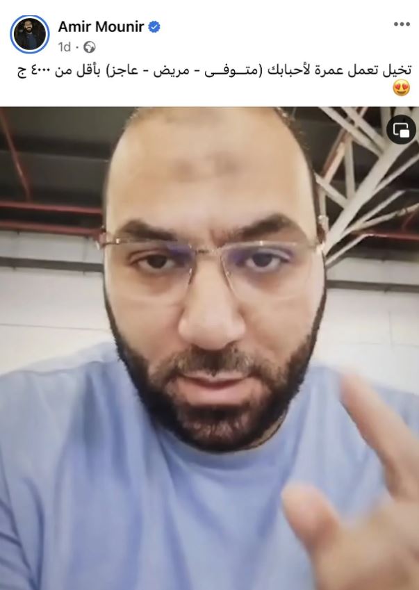 أثار الداعية الإسلامي أمير منير حالة من الجدل الكبير بين رواد السوشيال ميديا بعدما قام بنشر فيديو ترويجي لأحد التطبيقات الجديدة، عبر حسابه الشخصي بموقع التواصل الاجتماعي "فيسبوك"، ليعلن عن فرصة أداء مناسك العمرة لأحد الأقارب بمبلغ 4000 جنيهًا، وذلك عبر التطبيق الأون لاين.