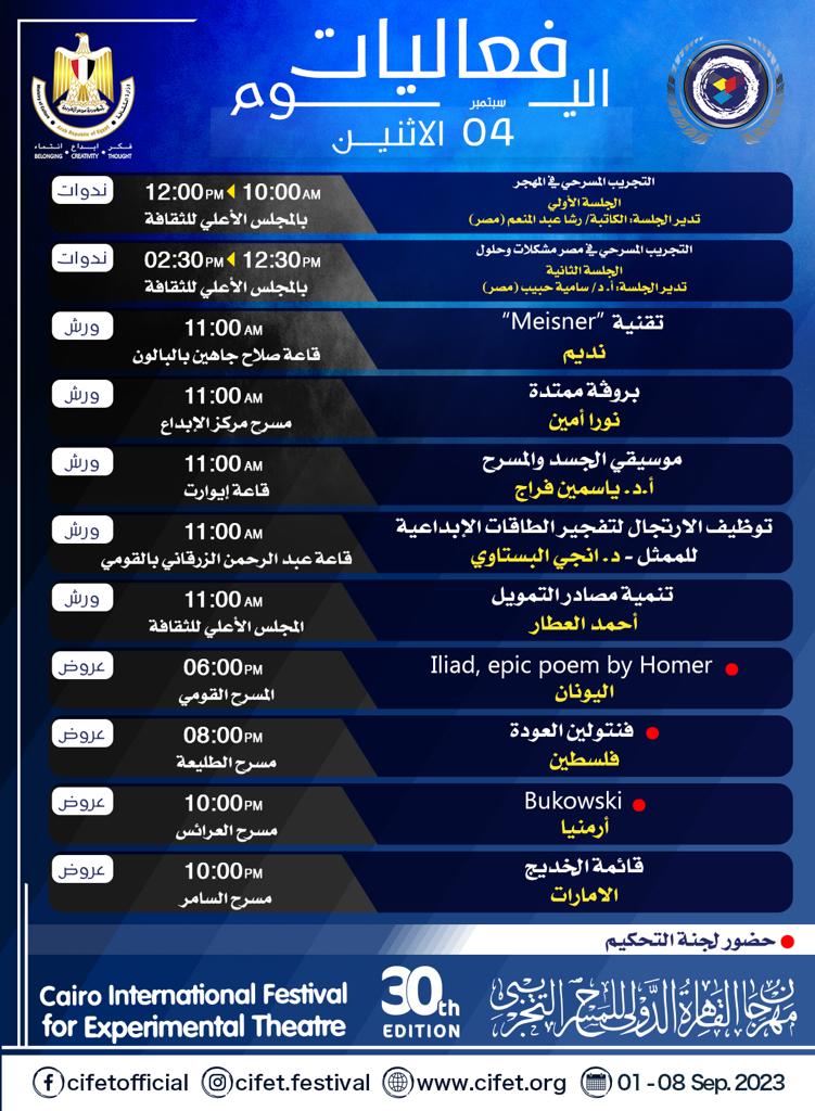 وفي تمام الساعة السادسة مساء، يعرض على المسرح القومي العرض اليوناني "Iliad, epic poem by Homer"، وفي تمام الساعة الثامنة مساء يُقدم العرض الفلسطيني "فنتولين العودة" على مسرح الطليعة، وفي تمام الساعة العاشرة مساء يُقدم العرض الإماراتي "قائمة الخديج" على مسرح السامر، وفي التوقيت نفسه يُقدم العرض الأرميني "Bukowski بوكوفيسكي" على مسرح العرائس.