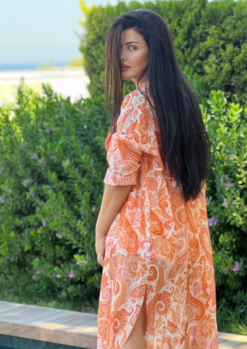 تألقت جومانا مراد بإطلالة مثيرة ولافتة للأنظار، حيث ارتدت هوت شورت وكارديجان مصممان من الشيفون الشفاف، ويحملان نفس النقشة التي تمزج بين اللونين الأبيض والبرتقالي، ونسقت عليهما توب قصير مكشوف البطن باللون البرتقالي، فيما انتعلت سليبر صيفي أنيق باللون الأبيض، مما أبرز أنوثتها الطاغية وقوامها الرشيق الممشوق.