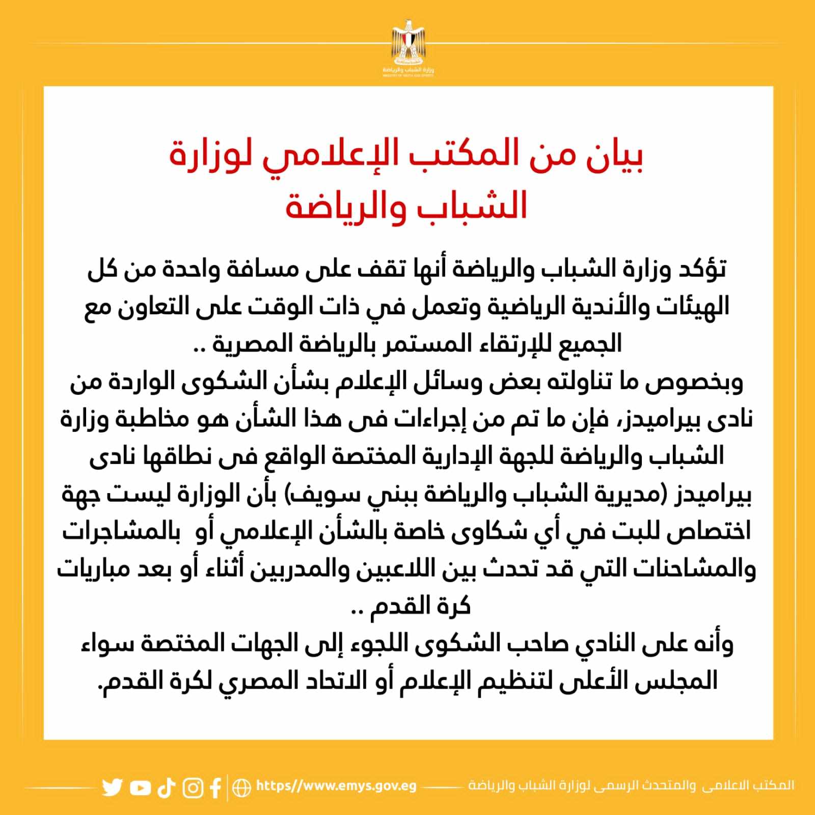 تؤكد وزارة الشباب والرياضة أنها تقف على مسافة واحدة من كل الهيئات والأندية الرياضية وتعمل في ذات الوقت على التعاون مع الجميع للإرتقاء المستمر بالرياضة المصرية .. وبخصوص ما تناولته بعض وسائل الإعلام بشأن الشكوى الواردة من نادى بيراميدز، فإن ما تم من إجراءات فى هذا الشأن هو مخاطبة وزارة الشباب والرياضة للجهة الإدارية المختصة الواقع فى نطاقها نادى بيراميدز (مديرية الشباب والرياضة ببني سويف) بأن الوزارة ليست جهة اختصاص للبت في أي شكاوى خاصة بالشأن الإعلامي أو  بالمشاجرات والمشاحنات التي قد تحدث بين اللاعبين والمدربين أثناء أو بعد مباريات كرة القدم .. وأنه على النادي صاحب الشكوى اللجوء إلى الجهات المختصة سواء المجلس الأعلى لتنظيم الإعلام أو الاتحاد المصري لكرة القدم.