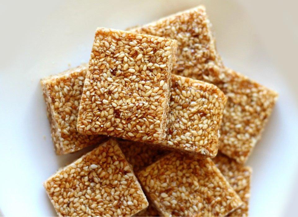 ثم نقوم بإضافة السمسم المحمص على الخليط مع التقليب الجيد.