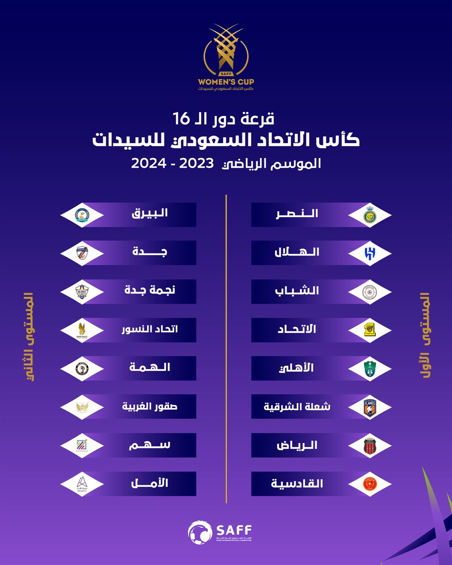 أُقيمت اليوم الأربعاء مراسم قرعة دور الستة عشر من منافسات بطولة كأس الاتحاد السعودي للسيدات لنسخة الموسم الحالي 2023-2024، والتي أسفرت عن مواجهات قوية بين أندية دوري المحترفين ودوري الدرجة الأولى.