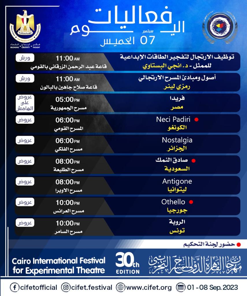 وفي تمام الساعة الخامسة يقدم العرض الراقص "فريدا" على خشبة مسرح الجمهورية بالعتبة، وفي تمام الساعة السادسة مساء، يعرض على خشبة المسرح القومي العرض الكونغولي الزامبي البلجيكي المشترك "Neci Padiri - نيكي باديري"، وفى التوقيت ذاته يٌقدم العرض الجزائري "نوستالجيا" على مسرح الفلكي بالجامعة الأمريكية، وفي تمام الساعة الثامنة مساء يُقدم العرض السعودي "صادق النمك" على مسرح الطليعة، وفي نفس التوقيت يقدم العرض المسرحي الإيطالي "APNEA"، وفى ذات التوقيت يعرض بالمسرح الكبير بدار الأوبرا الليتواني "Antigone أنتيجون"، وفي تمام الساعة العاشرة مساء يُقدم العرض التونسي "الروبة" على مسرح السامر، وفي التوقيت نفسه يُقدم العرض الجورجي "Othello عطيل" على مسرح العرائس.