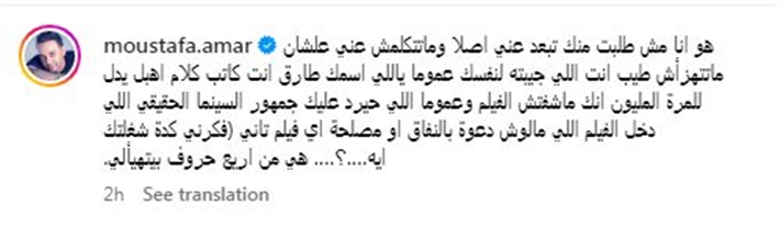 أضاف مصطفى قمر مهاجمًا طارق الشناوي: "طيب انت اللي جبته لنفسك عمومًا ياللي اسمك طارق، انت كاتب كلام أهبل يدل للمرة المليون انك ماشفتش الفيلم".
