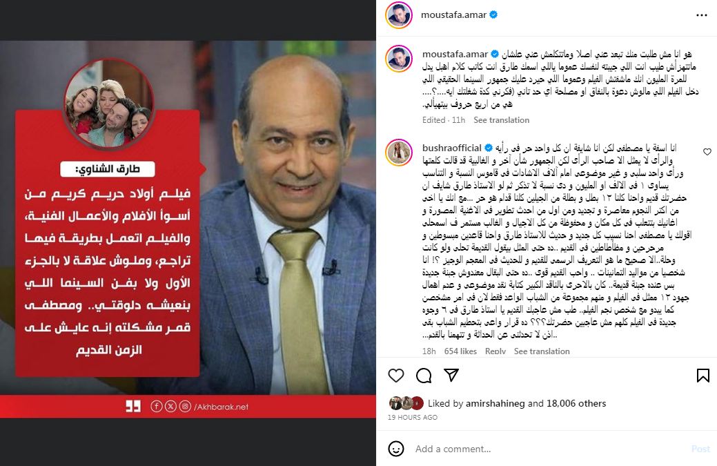 وبَّخَ مصطفى قمر الناقد طارق الشناوي برسالة شديدة اللهجة، خلال منشور عبر حسابه الشخصي بموقع تبادل الصور والفيديوهات "إنستجرام"، إذْ قال: "هو أنا مش طلبت منك تبعد عني أصلًا وماتتكلمش عني علشان ماتتهزأش".