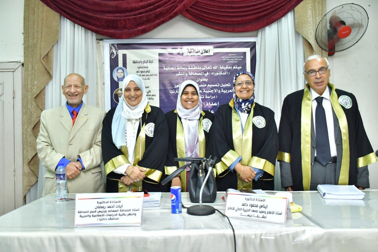 وتكونت لجنة مناقشة الدكتوراة من الدكتورة إيناس محمود حامد، أستاذ الإعلام، وعميد معهد الجزيرة العالي للإعلام وعلوم الاتصال "مشرفًا"، وعلي حسن، رئيس مجلس إدارة، ورئيس تحرير وكالة أنباء الشرق الأوسط "مناقشًا خارجيًا"، والأستاذة الدكتورة آيات أحمد رمضان، أستاذ الصحافة المساعد، ورئيس قسم الصحافة والنشر بكلية الدراسات الإسلامية والعربية بجامعة الأزهر "مناقشًا داخليًا"، وبحضور الأستاذ الدكتور جمال النجار، أستاذ الإعلام المتفرغ والعميد الأسبق لكلية الإعلام بجامعة النهضة.