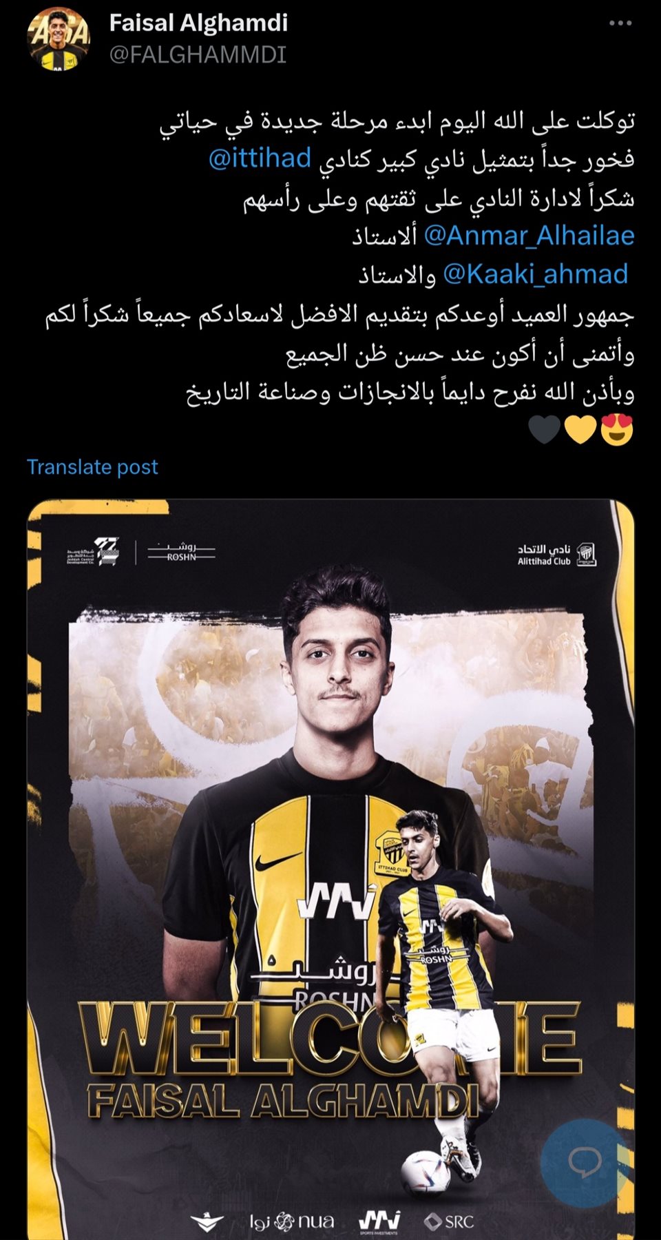 الجدي بالذكر أن نادي الاتحاد قد أعلن مؤخر عن تعاقده رسميًا مع اللاعب فيصل الغامدي -الذي كان يلعب بصفوف نادي الاتفاق-، لمدة 5 مواسم، حتى عام 2028، وتمنت له الإدارة التوفيق مع العميد وتحقيق تطلعات الجماهير خلال الفترة المقبلة.